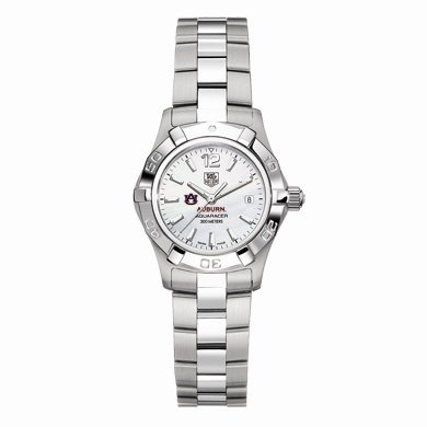 Auburn University TAG Heuer women's Aquaracer watch with AU logo; "Auburn University" is written underneath. White mother of pearl dial with polished markers. Brushed and Polished steel bracelet with double security clasp. Case stamped from a solid block of stainless steel (27 mm diameter.) Unidirectional rotating bezel. Luminescent hands and markers for optimum readability and radiance. Screw-in crown and caseback for water resistance to 300 meters. Swiss-made Quartz movement. Scratch-resistant sapphire crystal. Unique TAG Heuer presentation box. TAG Heuer international two-year warranty.