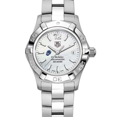 Berkeley TAG Heuer women's Aquaracer watch with bear claw logo; "UC Berkeley" is written underneath. White mother of pearl dial with polished markers. Brushed and Polished steel bracelet with double security clasp. Case stamped from a solid block of stainless steel (27 mm diameter.) Unidirectional rotating bezel. Luminescent hands and markers for optimum readability and radiance. Screw-in crown and caseback for water resistance to 300 meters. Swiss-made Quartz movement. Scratch-resistant sapphire crystal. Unique TAG Heuer presentation box. TAG Heuer international two-year warranty.