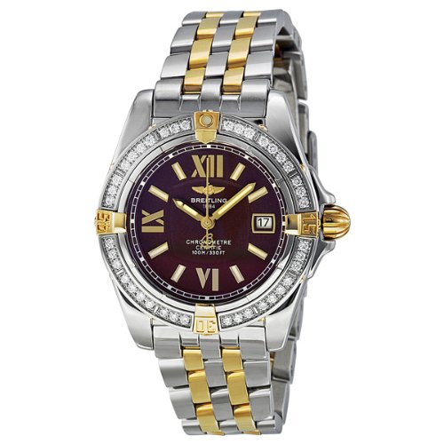 Stainless steel case with a 18 kt yellow gold and stainless steel bracelet. Uni-directional rotating bezel set with diamonds bezel. Burgundy dial with gold-tone hands and diamond hour markers. Roman numerals mark the 6, 9 and 12 o'clock positions. minute markers around the outer rim. Dial Type: Analog. Luminescent hands and markers. Date display appears at the 3 o'clock position. Quartz movement. Scratch resistant sapphire crystal. Pull / push crown. Solid case back. Case diameter: 31.8 mm. Round case shape. Band width: 16 mm. Fold over with safety clasp. Water resistant at 100 meters / 330 feet. Functions: date, hour, minute, second. Luxury watch style. Breitling Cockpit Lady Burgundy Diamond Gold and Stainless Steel Ladies Watch B7135653-K520TT.