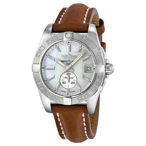 Stainless steel case with a brown leather strap. Bi-directional rotating stainless steel bezel. Mother of pearl dial with luminous hands and index hour markers. Minute markers around the outer rim. Dial Type: Analog. Luminescent hands and markers. Date display at the 3 o'clock position. Seconds sub-dial at the 6 o'clock position. Automatic movement. Scratch resistant sapphire crystal. Pull / push crown. Solid case back. Case diameter: 36 mm. Case thickness: 12.3 mm. Round case shape. Band width: 16 mm / 18 mm. Tang clasp. Water resistant at 100 meters / 330 feet. Functions: date, hour, minute, second. Luxury watch style. Watch label: Swiss Made. Breitling Galactic 36 Automatic Mother of Pearl Ladies Watch A3733011-A716BRLT.