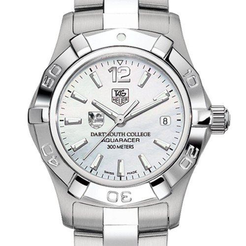 Dartmouth College TAG Heuer women's Aquaracer watch with Dartmouth seal in black; "Dartmouth College" is written underneath. White mother of pearl dial with polished markers. Brushed and polished steel bracelet with double security clasp. Case stamped from a solid block of stainless steel (27 mm diameter). Unidirectional rotating bezel. Luminescent hands and markers for optimum readability and radiance. Screw-in crown and caseback for water resistance to 300 meters. Swiss-made Quartz movement. Scratch-resistant sapphire crystal. Unique TAG Heuer presentation box. TAG Heuer international two-year warranty.