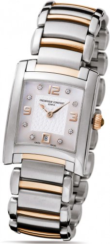 Case - Case Material: Stainless steel (polished) - Case Colour: Rose Gold / Silver - Case Shape: Rectangular - Back: Stainless steel back - Bezel made of: Stainless Steel (polished) - Crystal: Sapphire crystal Movement - Display Type: Hours, Minutes - Movement: Swiss Quarz - Calendar: Date - Other Functions: Additional Satin Strap Dial - Dial Colour: Silver - Dial Style: With Diamonds - Hand: not fluorescent Strap - Strap Material: Stainless steel (brushed/polished) - Strap Colour: Rose Gold / Silver - Clasp: Hidden Folding Clasp Further Details - Product: Women's - Manufacturer: Frederique Constant Geneve - Modell: 220WAD2EC2B - Delight - Special Feature: with genuine diamonds - Logo on: Dial, Crown, Back - Metal Fineness / Metal Type: Stainless Steel 316L - Guarantee: 2 Years Manufacturer's Guarantee - Packaging: Original Packaging, Instructions, Diamond Certificate Technical Details - Diameter (without crown) in mm/inches: 28 / 1,1 - Height in mm/inches: 8 / 0,31 - Distance between lugs in mm/inches: 34 / 1,2 - Water-restistant (m/bar): 30 / 3 - Weight in g/ounces: 113 / 3,99 - Width of the Strap in mm/Inches: 16 / 0,63 - Maximal Strap Circumference in mm/inches: 190 / 7,48