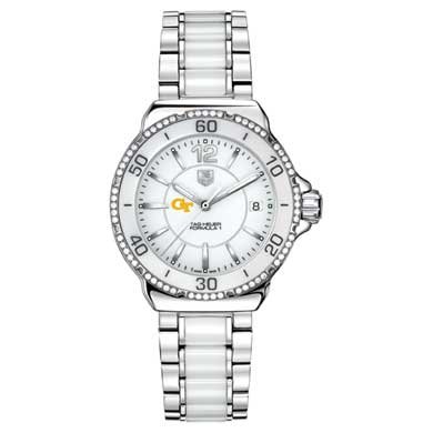 Georgia Tech TAG Heuer women's Formula 1 ceramic watch with 60 radiant diamonds. Elegant dial with the GT logo.Larger sized, polished steel case (37mm diameter). White ceramic bezel inset with 60 Top Wesselton diamonds. Stainless steel and ceramic bracelet with push-button deployment buckle. Luminescent hands and indexes for optimum readability and radiance. Scratch resistant sapphire crystal . Screw-in crown and caseback for water resistance up to 200 meters. Swiss-made Quartz movement. Unique TAG Heuer presentation box. TAG Heuer international two-year warranty.