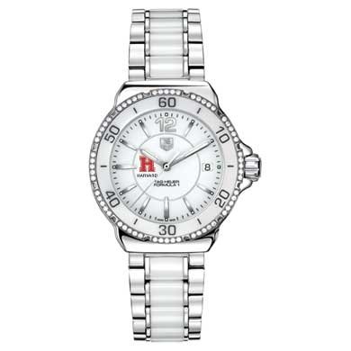Harvard University TAG Heuer women's Formula 1 ceramic watch with 60 radiant diamonds. Elegant dial with the Harvard logo and "Harvard" underneath.Larger sized, polished steel case (37mm diameter). White ceramic bezel inset with 60 Top Wesselton diamonds. Stainless steel and ceramic bracelet with push-button deployment buckle . Luminescent hands and indexes for optimum readability and radiance. Scratch resistant sapphire crystal. Screw-in crown and caseback for water resistance up to 200 meters. Swiss-made Quartz movement. Unique TAG Heuer presentation box. TAG Heuer international two-year warranty.