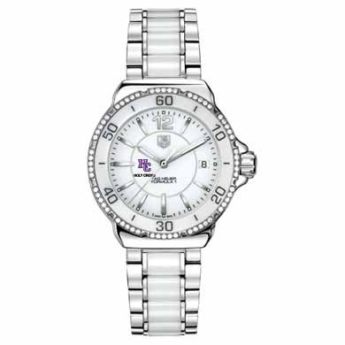 College of the Holy Cross TAG Heuer women's Formula 1 ceramic watch with 60 radiant diamonds. Elegant dial with the Holy Cross logo with "Holy Cross" underneath.Larger sized, polished steel case (37mm diameter). White ceramic bezel inset with 60 Top Wesselton diamonds. Stainless steel and ceramic bracelet with push-button deployment buckle . Luminescent hands and indexes for optimum readability and radiance. Scratch resistant sapphire crystal. Screw-in crown and caseback for water resistance up to 200 meters. Swiss-made Quartz movement. Unique TAG Heuer presentation box. TAG Heuer international two-year warranty.