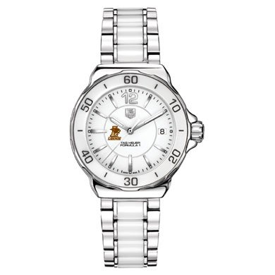 Lehigh University TAG Heuer women's Formula 1 ceramic watch with Lehigh logo and "Lehigh". Stunning white ceramic bezel with matching bracelet.Larger sized, polished steel case (37mm diameter). Fashionable white ceramic rotating bezel. Stainless steel and ceramic bracelet with push-button deployment buckle . Luminescent hands and indexes for optimum readability and radiance. Scratch resistant sapphire crystal. Screw-in crown and caseback for water resistance up to 200 meters. Swiss-made Quartz movement. Unique TAG Heuer presentation box. TAG Heuer international two-year warranty.