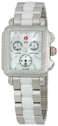 Stainless steel case with a stainless steel with white ceramic center links bracelet. Fixed stainless steel set with 108 diamonds (60ct) bezel. Mother of pearl dial with luminous silver-tone hands and stick hour markers. Minute markers around the outer rim. Luminiscent hands. Date display at the 6 o'clock position. Three - 60 seconds, 30 minutes and 1/10th of a second. Swiss quartz movement. Scratch resistant mineral crystal. Solid case back. Case diameter: 33 mm x 46 mm.. Water resistant at 50 meters / 165 feet. Functions: hours, minutes, seconds, date, chronograph. Michele Deco Diamond Ladies Watch MWW06A000716.