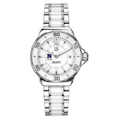 Naval Academy TAG Heuer women's Formula 1 ceramic watch with Naval Academy logo and "USNA". Stunning white ceramic bezel with matching bracelet. Larger sized, polished steel case (37mm diameter). Fashionable white ceramic rotating bezel. Stainless steel and ceramic bracelet with push-button deployment buckle. Luminescent hands and indexes for optimum readability and radiance. Scratch resistant sapphire crystal. Screw-in crown and caseback for water resistance up to 200 meters. Swiss-made Quartz movement. Unique TAG Heuer presentation box. TAG Heuer international two-year warranty.