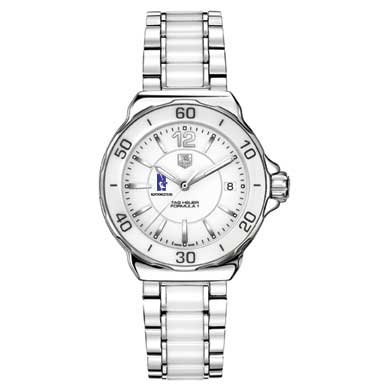 Northwestern University TAG Heuer women's Formula 1 ceramic watch with Northwestern logo and "Northwestern". Stunning white ceramic bezel with matching bracelet.Larger sized, polished steel case (37mm diameter). Fashionable white ceramic rotating bezel. Stainless steel and ceramic bracelet with push-button deployment buckle . Luminescent hands and indexes for optimum readability and radiance. Scratch resistant sapphire crystal. Screw-in crown and caseback for water resistance up to 200 meters. Swiss-made Quartz movement. Unique TAG Heuer presentation box . TAG Heuer international two-year warranty .