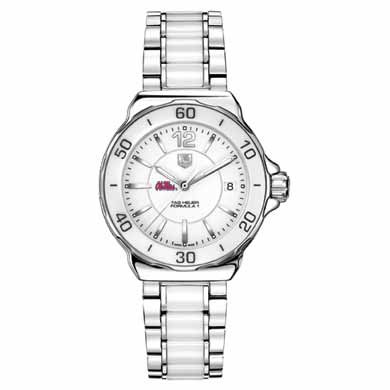University of Mississippi TAG Heuer women's Formula 1 ceramic watch with Ole Miss logo. Stunning white ceramic bezel with matching bracelet. Larger sized, polished steel case (37mm diameter). Fashionable white ceramic rotating bezel. Stainless steel and ceramic bracelet with push-button deployment buckle. Luminescent hands and indexes for optimum readability and radiance. Scratch resistant sapphire crystal . Screw-in crown and caseback for water resistance up to 200 meters. Swiss-made Quartz movement. Unique TAG Heuer presentation box. TAG Heuer international two-year warranty.