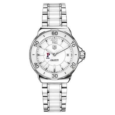 University of Pennsylvania TAG Heuer women's Formula 1 ceramic watch with Pennsylvania logo and "Penn". Stunning white ceramic bezel with matching bracelet.Larger sized, polished steel case (37mm diameter). Fashionable white ceramic rotating bezel. Stainless steel and ceramic bracelet with push-button deployment buckle. Luminescent hands and indexes for optimum readability and radiance. Scratch resistant sapphire crystal. Screw-in crown and caseback for water resistance up to 200 meters. Swiss-made Quartz movement. Unique TAG Heuer presentation box. TAG Heuer international two-year warranty.