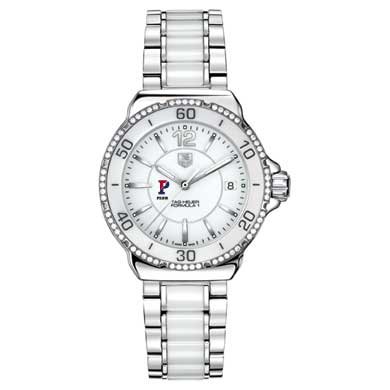 University of Pennsylvania TAG Heuer women's Formula 1 ceramic watch with 60 radiant diamonds. Elegant dial with the Pennsylvania logo and "Penn" underneath.Larger sized, polished steel case (37mm diameter). White ceramic bezel inset with 60 Top Wesselton diamonds. Stainless steel and ceramic bracelet with push-button deployment buckle . Luminescent hands and indexes for optimum readability and radiance. Scratch resistant sapphire crystal . Screw-in crown and caseback for water resistance up to 200 meters. Swiss-made Quartz movement. Unique TAG Heuer presentation box . TAG Heuer international two-year warranty .