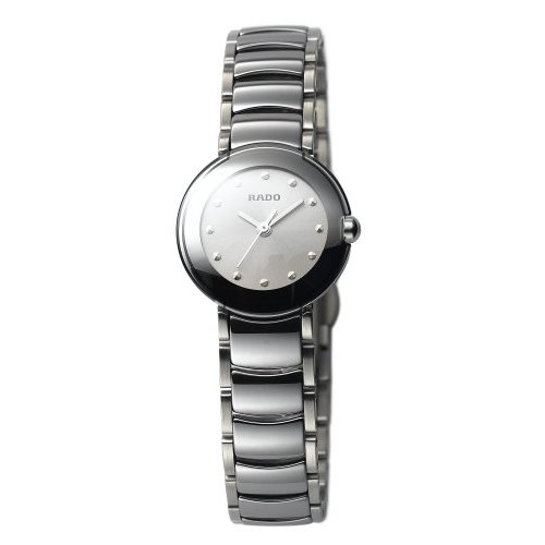 Platinum Ceramic Case. Stainless Steel And Platinum Ceramic Strap. Silver With 11 Tiny Diamond Hour Markers Dial. Fixed Bezel. Scratch Resistant Sapphire Crystal. Deployment Clasp. 23 mm Case Diameter. Quartz Movement. Water Resistant At 30 Meters (100 Feet). Rado Coupole Steel Platinum Ceramic Ladies Watch R22594102Platinum Ceramic Case. Stainless Steel And Platinum Ceramic Strap. Silver With 11 Tiny Diamond Hour Markers Dial. Fixed Bezel. Scratch Resistant Sapphire Crystal. Deployment Clasp. 23 mm Case Diameter. Quartz Movement. Water Resistant At 30 Meters (100 Feet). Rado Coupole Steel Platinum Ceramic Ladies Watch R22594102A fashionable timepiece for any occasion, the thin-profile Rado Coupole women's watch (model R22594102) will sit demurely and lightly on your wrist. Blending cool, contemporary styling with high-tech functionality, it also adds a bit of dazzle for special occasions thanks to the 11 tiny diamond dial markers. Made of high-tech ceramics, it's amazingly durable and virtually scratch-proof. It features a perfectly round silver ceramic watch case that measures 23mm in diameter (0.97 inches), which flows smoothly into the bracelet band that mixes scalloped silver ceramic pieces with stainless steel connecting links. The silver dial features thin silver hands (with seconds hand) in addition to the diamond markers. Other features include a domed scratch-resistant sapphire crystal, ultra-precise Swiss quartz analog movement, and water resistance to 30 meters (99 feet). The raw material for Rado's high-tech ceramics is a very fine powder that is pressed or injected into a mold. The powder is compacted into scratchproof ceramic parts in a sintering blast furnace of 1,450 degrees Celsius. These parts are given a brilliant shin by polishing with diamond dust. Highly resistant to scratches, Rado's high-tech ceramics rate an 8 on a scratch-proof scale of 1 to 10 (with aluminum rated less than 3, gold less than 4, steel less than 5, and diamond topping the scale at 10). About Rado Founded in Switzerland in 1917, Rado didn't come to prominence until 1962 when the company released the DiaStar--the first watch to be made from scratch-proof hard metal. While other companies use conventional materials like gold, brass or steel, Rado uses ultra-durable materials such as sapphire crystal and high-tech ceramics that had been used in the development of the space shuttle. In 1996, Rado made watch history again presenting with the DiaStar Concept 1--the first watch made from polycrystalline diamond (PCD), a material that has the same hardness as natural diamond. Accuracy, high performance, and lasting value are key to the Rado philosophy--a perfect match to the unique design found throughout the company's timepiece collections.