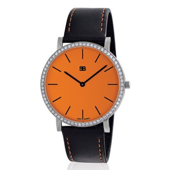 Steel Blaze brings you the amazingly sleek new SOB collection of watches All Stainless Steel watch with an ultra thin steel case, orange dial, black hour markers and a water-resistant black leather strap with orange stitching. Beautifully set with with 66 sparkling diamonds, 1.15ct. total weight. 40mm wide, 6.5mm thick weighs only 1.3 oz. Scratch-resistant sapphire crystal Ronda Slim-tech 1062 Swiss quartz movement Water-Resistant to 165 feet. includes a 2-year warranty