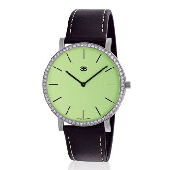 Steel Blaze brings you the amazingly sleek new SOB collection of watches All Stainless Steel watch with an ultra thin steel case, light green dial, black hour markers and a water-resistant black leather strap with light green stitching. Beautifully set with with 66 sparkling diamonds, 1.15ct. total weight. 40mm wide, 6.5mm thick weighs only 1.3 oz. Scratch-resistant sapphire crystal Ronda Slim-tech 1062 Swiss quartz movement Water-Resistant to 165 feet. includes a 2-year warranty