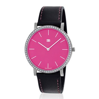 Steel Blaze brings you the amazingly sleek new SOB collection of watchesAll Stainless Steel watch with an ultra thin steel case, pink dial, white hour markers and a water-resistant black leather strap with pink stitching. Beautifully set with with 66 sparkling diamonds, 1.15ct. total weight.40mm wide, 6.5mm thickweighs only 1.3 oz.Scratch-resistant sapphire crystalRonda Slim-tech 1062 Swiss quartz movementWater-Resistant to 165 feet.includes a 2-year warranty