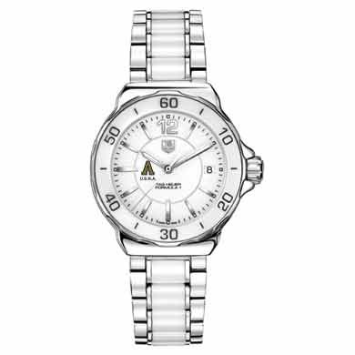 West Point TAG Heuer women's Formula 1 ceramic watch with The US Military Academy logo and "USMA". Stunning white ceramic bezel with matching bracelet.Larger sized, polished steel case (37mm diameter). Fashionable white ceramic rotating bezel. Stainless steel and ceramic bracelet with push-button deployment buckle. Luminescent hands and indexes for optimum readability and radiance. Scratch resistant sapphire crystal. Screw-in crown and caseback for water resistance up to 200 meters. Swiss-made Quartz movement. Unique TAG Heuer presentation box. TAG Heuer international two-year warranty.