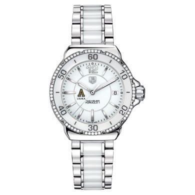 West Point TAG Heuer women's Formula 1 ceramic watch with 60 radiant diamonds. Elegant dial with the US Military Academy logo with "U.S.M.A" underneath.Larger sized, polished steel case (37mm diameter). White ceramic bezel inset with 60 Top Wesselton diamonds. Stainless steel and ceramic bracelet with push-button deployment buckle . Luminescent hands and indexes for optimum readability and radiance. Scratch resistant sapphire crystal. Screw-in crown and caseback for water resistance up to 200 meters. Swiss-made Quartz movement. Unique TAG Heuer presentation box . TAG Heuer international two-year warranty.